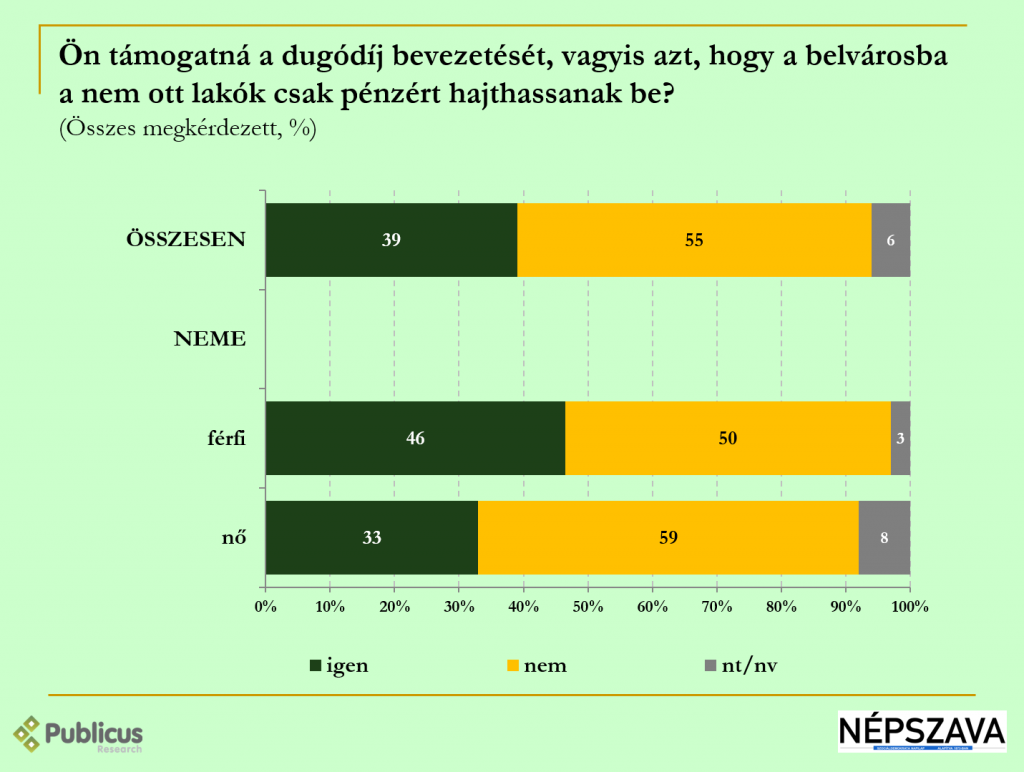 Tízből négy fővárosi (39 százalék) támogatja a dugódíjat, míg több mint a felük (55 százalék) nem. Az egyébként többet autózó férfiak körében magasabb a dugódíj támogatottsága, mint a nők körében (46 vs. 33 százalék).