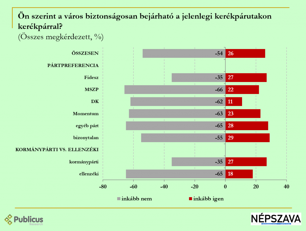 A megkérdezett fővárosiak negyede (26 százalék) gondolja úgy, hogy a város biztonságosan bejárható a jelenlegi kerékpárutakon kerékpárral, míg több mint felük (54 százalék) szerint nem.