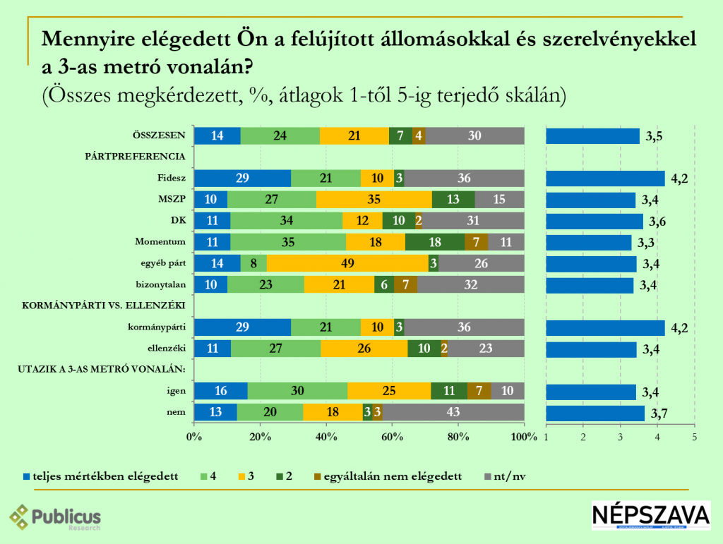 A felújított állomásokkal és szerelvényekkel a megkérdezettek átlagosan elégedettek (3,5 pont 1-5-ig terjedő iskolai osztályzat skálán), ám figyelemreméltó, hogy a kormánypárti szavazók sokkal elégedettebbek, mint az ellenzékiek és a bizonytalanok (4,2 vs. 3,4 és 3,4). Fontos jelezni, továbbá, hogy az M3-as metrót rendszeresen használók elégedetlenebbek vele, mint akik nem használják azt (3,4 vs 3,7).