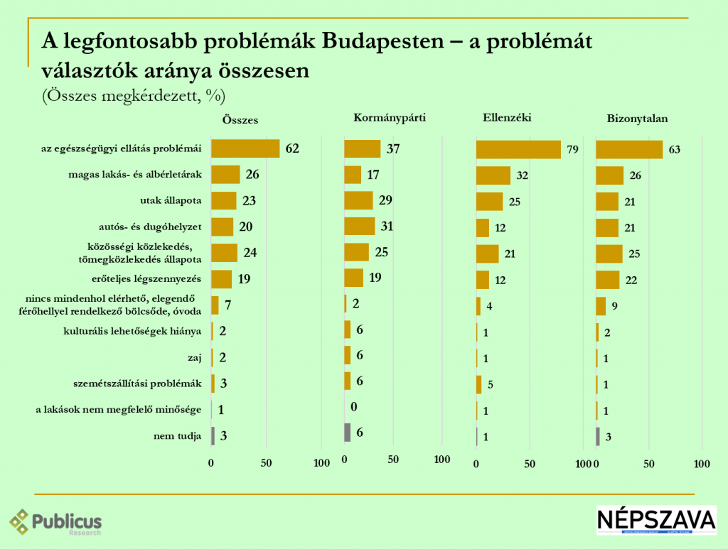 A budapesti választók majd’ kétharmada (62 százalék) említette, hogy az egészségügyi ellátás problémái jelentik számára a legfontosabb problémát. Leginkább az ellenzéki (79 százalék) és a bizonytalan ( 63 százalék) szavazók körében magas az említés aránya, ám a probléma a Fidesz szavazói körében is a legemlítettebb, annak ellenére, hogy csak több mint harmaduk (37 százalék) említette.