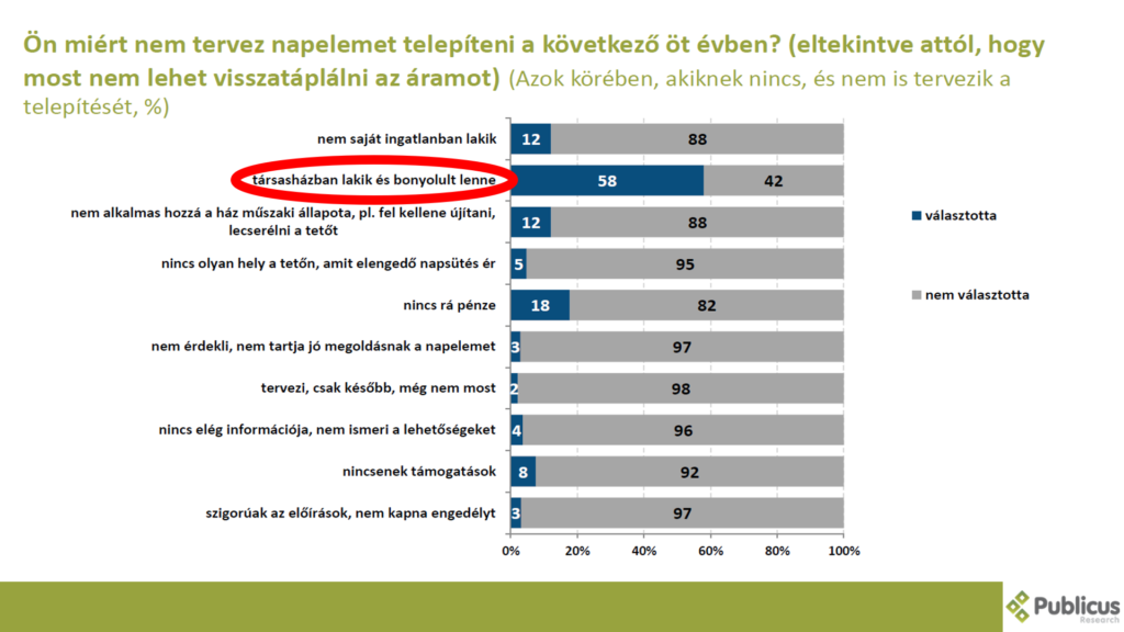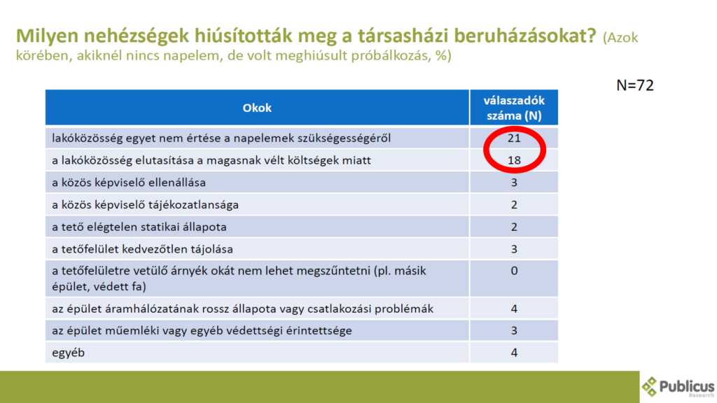 Ebből a 72 főből 21-en mondták azt, hogy az hiúsította meg a társasházi beruházásokat, hogy a lakóközösség nem értett egyet a napelemek szükségességéről. 18-an nyilatkoztak úgy, hogy a lakóközösség túl magasnak vélte a költségeket, és emiatt került a beruházás elutasításra