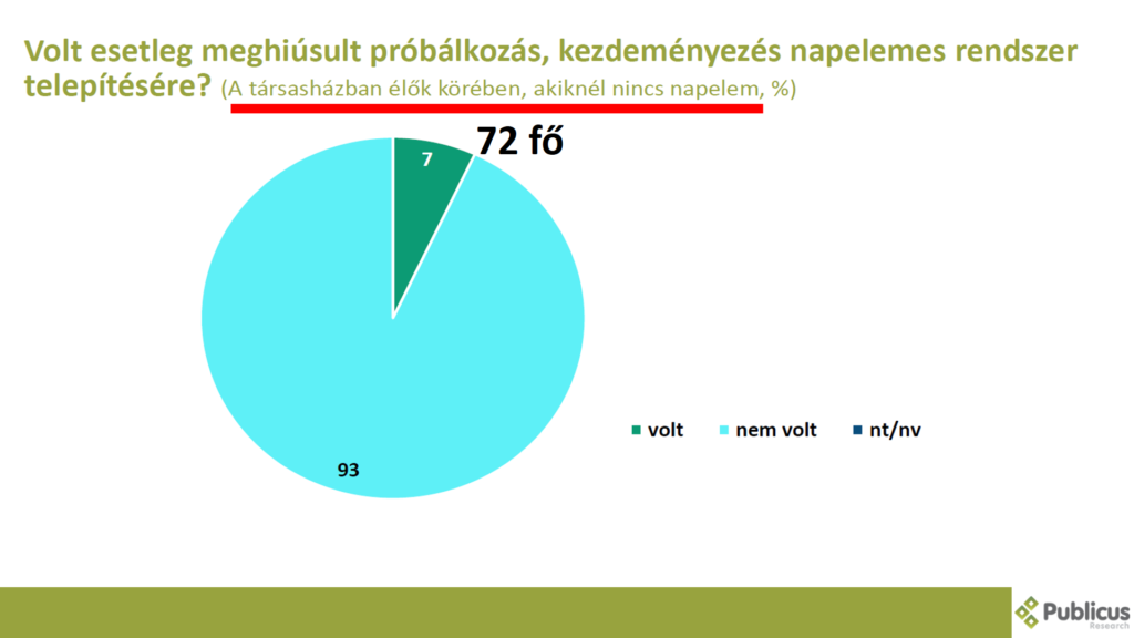 A társasházban élők közül – akiknél nincs napelem – a válaszadók 7 százaléka (összesen 72 fő) mondta azt, hogy volt meghiúsult próbálkozás, kezdeményezés napelemes rendszer telepítésére.