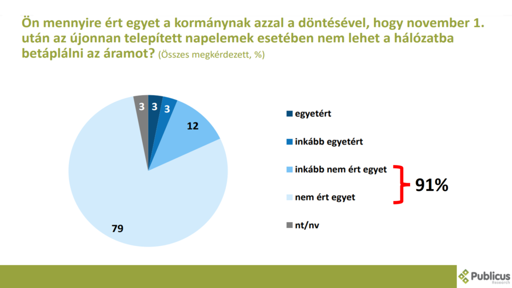 Tízből kilenc megkérdezett (91 százalék) vagy nem ért egyet (79 százalék), vagy inkább nem ért egyet (12 százalék) a kormánynak azzal a döntésével, hogy november 1. után az újonnan telepített napelemek esetében nem lehet a hálózatban betáplálni az áramot.