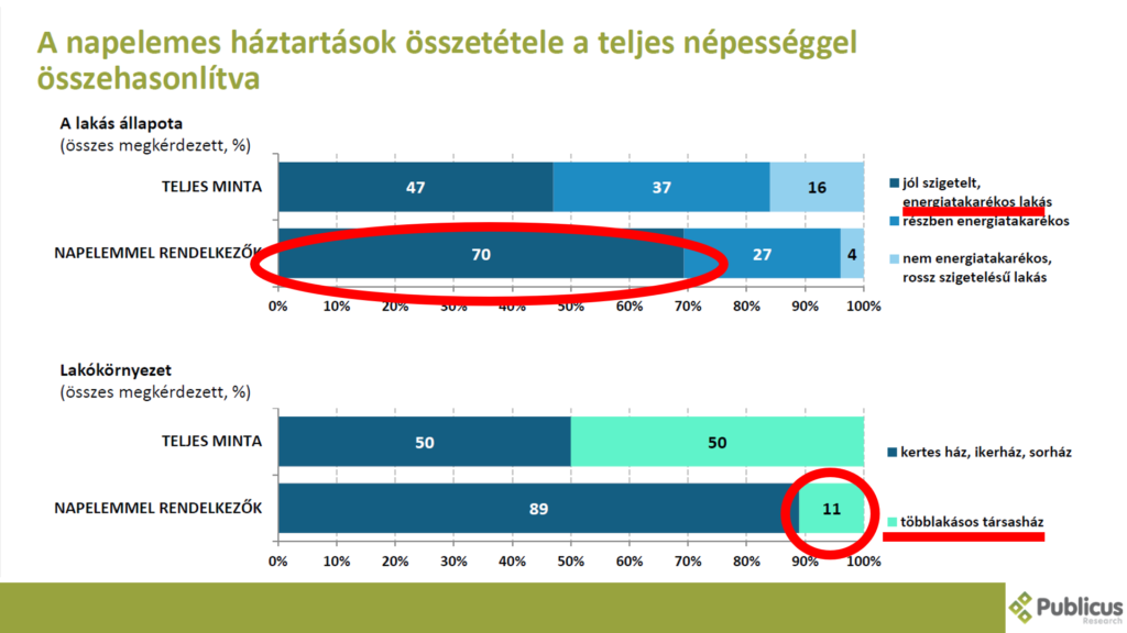 A napelemmel rendelkezők közül tízből heten (70 százalék) mondták azt, hogy jól szigetelt, energiatakarékos lakásban él, a negyedük (27 százalék) részben energiatakarékos, 4 százalékuk pedig nem energiatakarékos, rossz szigetelésű lakásban.