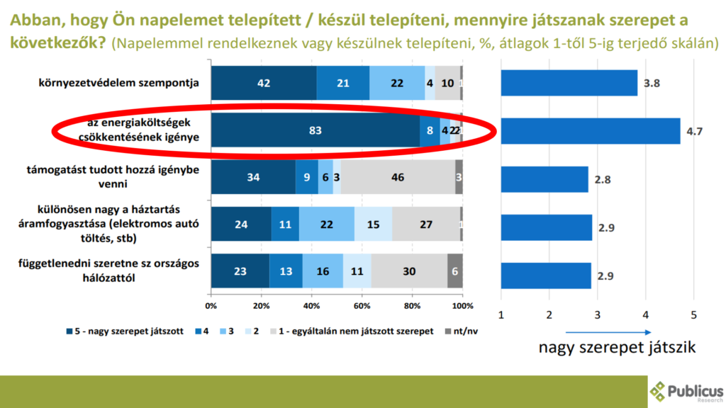 A válaszadóknál leginkább az játszott/játszik szerepet hogy napelemet telepítettek/ készülnek telepíteni, hogy csökkentsék az energiaköltségeket.  Egy egytől ötig terjedő skálán átlagban 4.7 pontot kapott ez a tényező. Utána következik a környezetvédelmi szempont (3,8 pont), utána pedig szorosan egymáshoz közel az alábbi három tényező: különösen nagy a háztartás áramfogyasztása (elektromos autó, töltés, stb ) 2,9 pont; függetlenedni szeretne az országos hálózattól: 2,9 pont; támogatást tudott igénybe venni hozzá: 2,8 pont.
