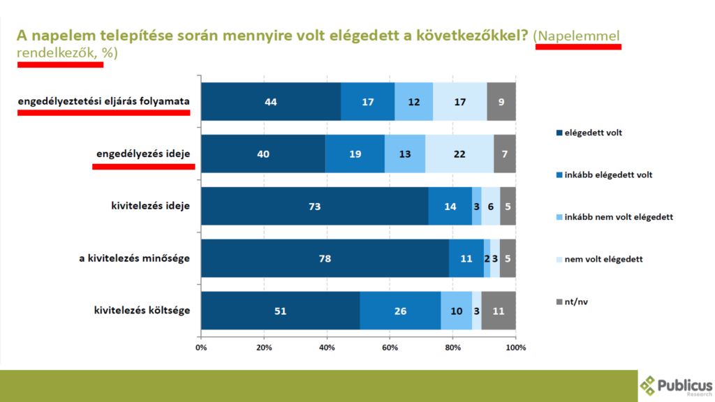 A napelem telepítése során tízből nyolc megkérdezett (78 százalék) mondta azt, hogy a kivitelezés minőségével, a válaszadók háromnegyede (73 százalék) pedig azt, hogy a kivitelezés idejével elégedettek voltak. Minden második megkérdezett (51 százalék) volt elégedett a kivitelezés költségével. A legkevésbé elégedettek az engedélyeztetési eljárás folyamatával (44 százalék), illetve az engedélyezés idejével voltak. (40 százalék).