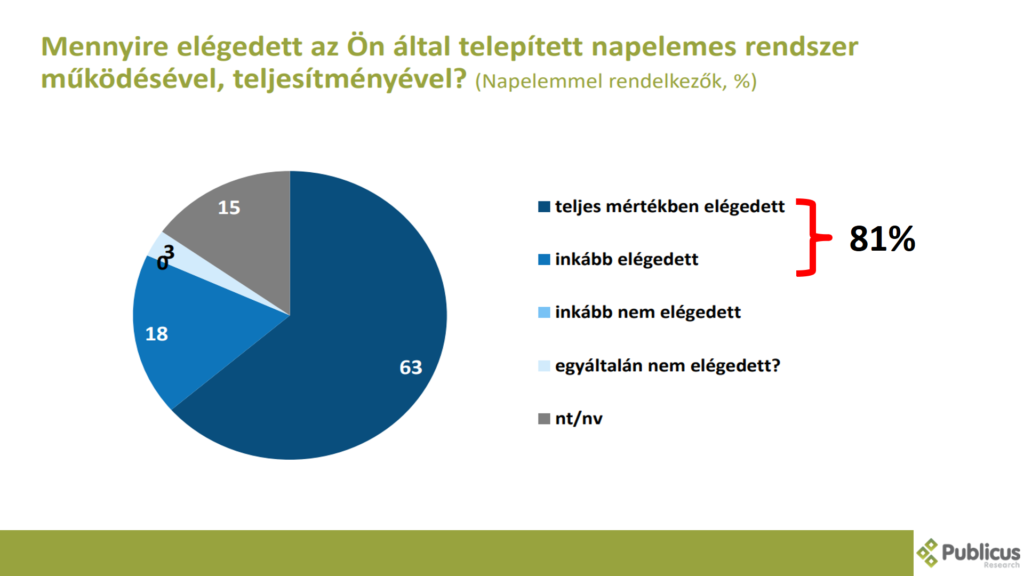 Tízből nyolc válaszadó (81 százalék) mondta azt, hogy vagy teljes mértékben elégedett (63 százalék) vagy pedig inkább elégedett (18 százalék) az általuk telepített napelemes rendszer működésével, teljesítményével.