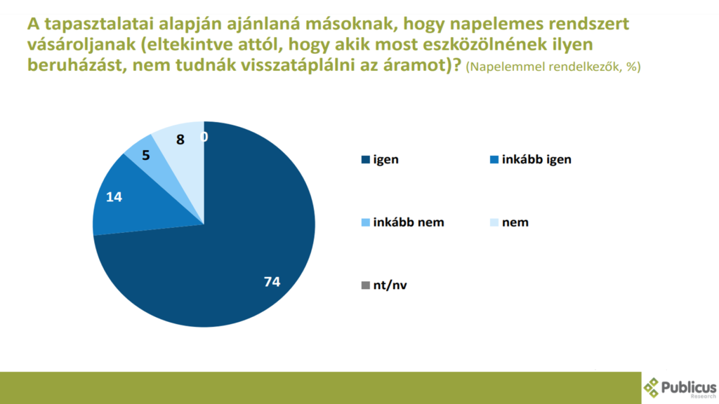 Tízből kilenc (88 százalék) válaszadó mondta azt, hogy tapasztalatai alapján vagy ajánlaná (74 százalék), vagy inkább ajánlaná (14 százalék) másoknak, hogy napelemes rendszert vásároljanak (eltekintve attól, hogy akik most eszközölnének ilyen beruházást, nem tudnák visszatáplálni az áramot).