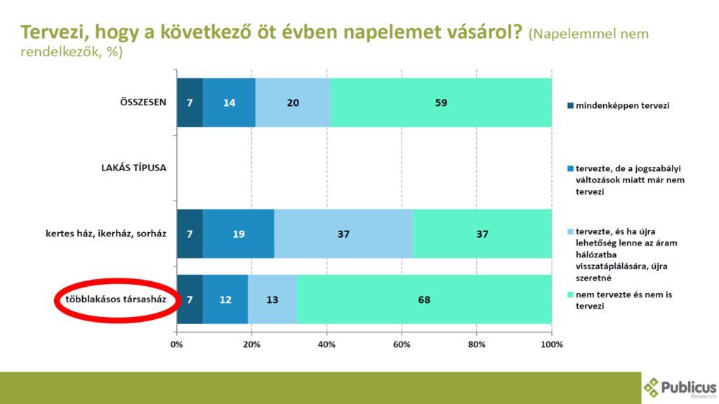 A legfőbb ok, ami miatt a válaszadók nem terveznek napelemet telepíteni a következő öt évben (eltekintve attól, hogy most nem lehet visszatáplálni az áramot), hogy társasházban laknak és bonyolult lenne ezt kivitelezni (58 százalék). Utána a legtöbben azt hozták fel indoknak, hogy nincs rá pénzük (18 százalék), vagy nem alkalmas hozzá a ház műszaki állapota, pl: fel kellene újítani, lecserélni a tetőt (12 százalék), vagy pedig nem saját ingatlanban lakik (12 százalék).