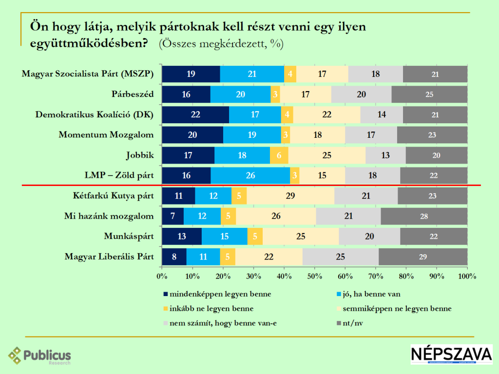 Így a válaszadók többsége (36-42 százalék vs. 18-31 százalék) szerint ez együttműködés pártjai az MSZP, Párbeszéd, a DK, a Momentum, a Jobbik és az LMP.