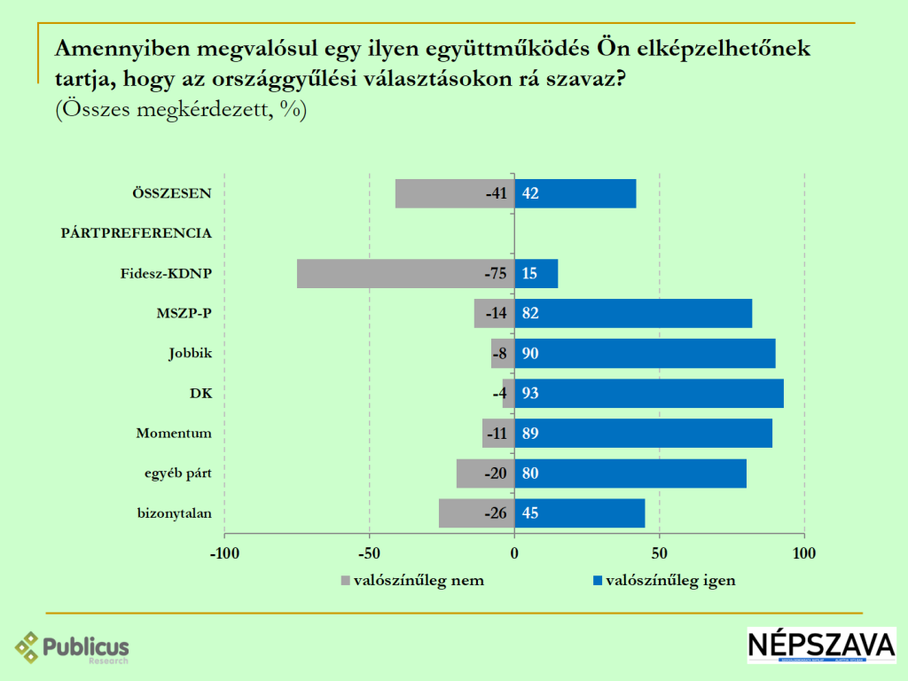 A válaszadók kis többsége (42 százalék, 41 ellenében) elképzelhetőnek tartja, hogy egy országgyűlési választáson szavazzon egy ilyen ellenzéki együttműködésre – az ellenzéki szavazók 90 százaléka szavazna egy ilyen formációra, és ha létrejön a Fidesz szavazók 15 százaléka is elképzelhetőnek tartja ezt.