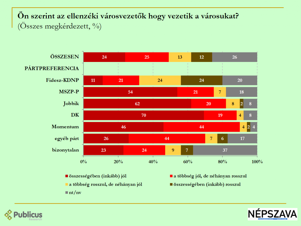 Egyértelmű pártos törésvonal figyelhető meg: ötből négy ellenzéki szavazó (80 százalék) szerint inkább jó munkát végeznek az ellenzéki városvezetők, és csupán 6 százalékuk szerint inkább rosszul.