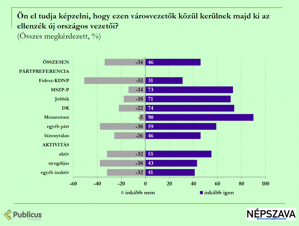 A válaszadók többsége (46 százalék, 34 ellenében) el tudja képzelni, hogy a jelenlegi ellenzéki városvezetők közül kerülnek majd ki az ellenzék új országos vezetői.