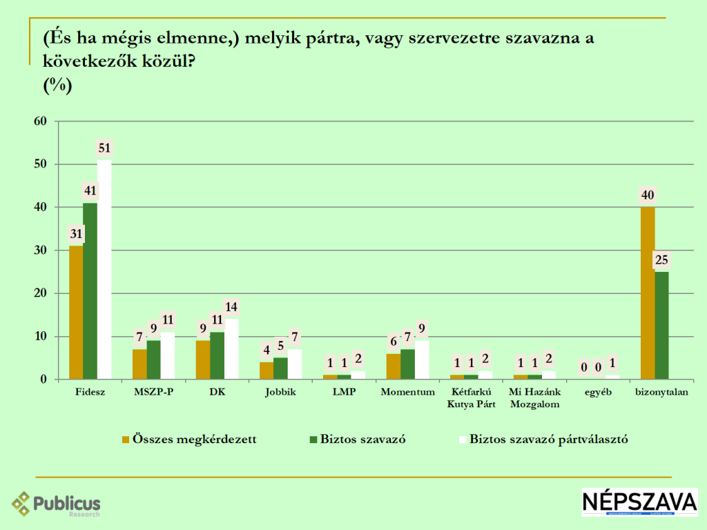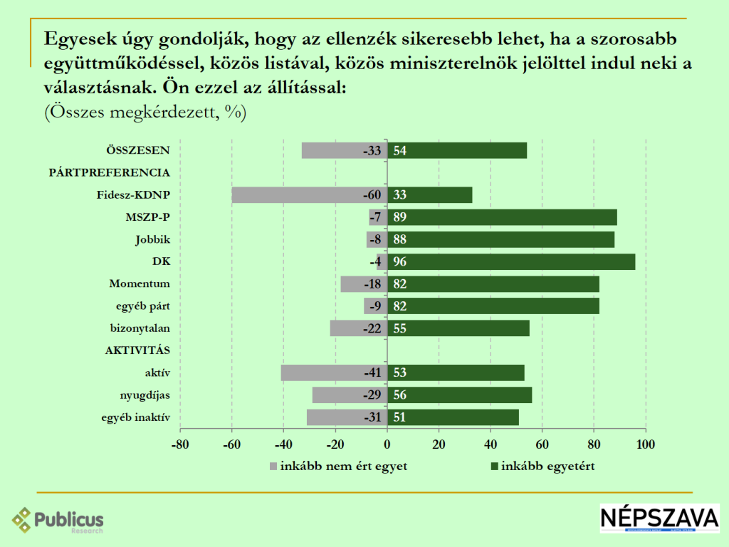 Az ellenzéki szavazók 90 százaléka szavazna egy ilyen formációra, leginkább a DK, a Jobbik és a Momentum szavazói (93, 90, 89 százalék), sőt, a bizonytalanok többsége is (45 százalék, 26 ellenében).