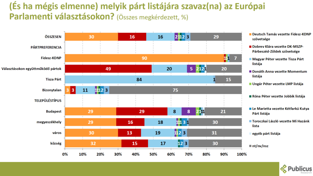 Az összes megkérdezett körében a válaszadók 30 százaléka a Deutsch Tamás vezette Fidesz-KDNP listájára, 16 százalék a Dobrev Klára vezette DK-MSZP-Párbeszéd-Zöldek listájára, illetve szintén 16 százalék pedig a Magyar Péter vezette Tisza Párt listájára szavazna a közelgő EP választáson.