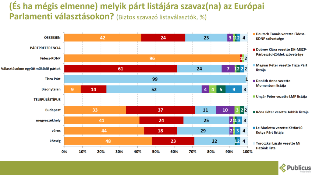 A biztos pártválasztók körében 42 százalék a Deutsch Tamás vezette Fidesz-KDNP listájára, 24 százalék a Dobrev Klára vezette DK-MSZP-Párbeszéd-Zöldek listájára, 23 százalék pedig a Magyar Péter vezette Tisza Párt listájára szavazna a közelgő EP választáson. Magyar Péter pártja főleg a kisebb pártoktól vett el szavazókat.
