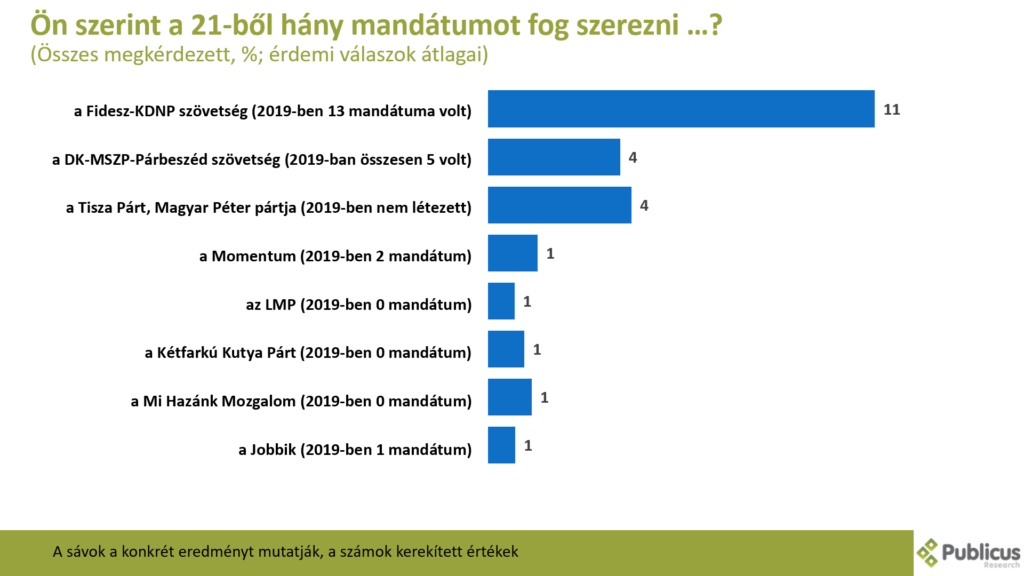 A válaszadók szerint a 21 mandátumból a Fidesz-KDNP 11 mandátumot (2019-ben 13 mandátuma volt), a Tisza Párt 4 mandátumot, a DK-MSZP-Párbeszéd pedig 4 mandátumot (2019-ben együtt 5 mandátumok volt) szerezhetnek.