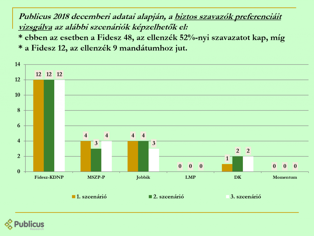 Ha ebből a helyzetből indulunk ki, akkor a szimulációk eredményeként a Fidesz 12 mandátumra számíthat, és az ellenzéki pártok összesen 9-re, úgy hogy csak az MSZP, a Jobbik és a DK kap mandátumot. Az MSZP és a Jobbik a konkrét eredmény függvényében 3-4 mandátummal kalkulálhat, a DK pedig egyel vagy kettővel.