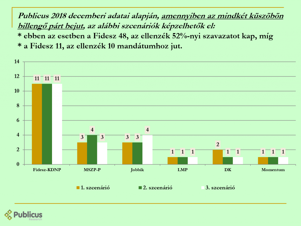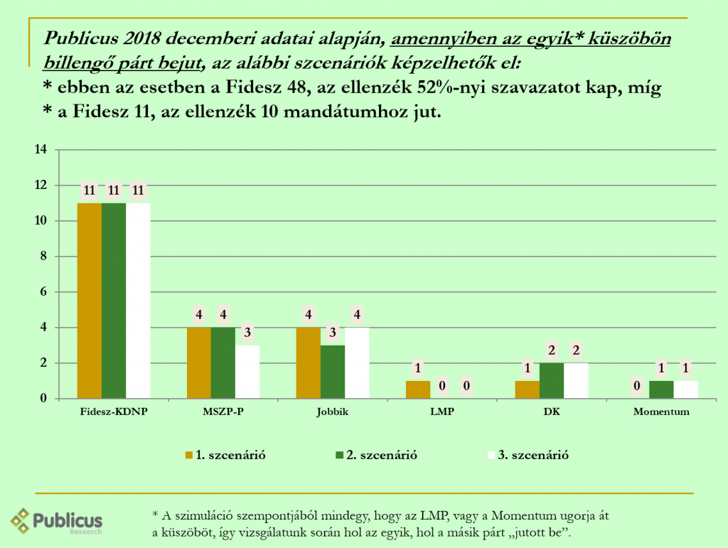 Amennyiben mindkét „billegő” párt átugorja a küszöböt, a Fidesz mandátumszáma továbbra sem változik 11 marad, azonban másként osztódnak el az EP helyek az ellenzéki pártok körében. Ebben az esetben az MSZP és a Jobbik nagyobb valószínűséggel kap 3 mandátumot, mint négyet, és a DK is nagyobb eséllyel kevesebb mandátumra számíthat, míg az LMP és a Momentum 1-1 képviselőt küldhet Brüsszelbe.