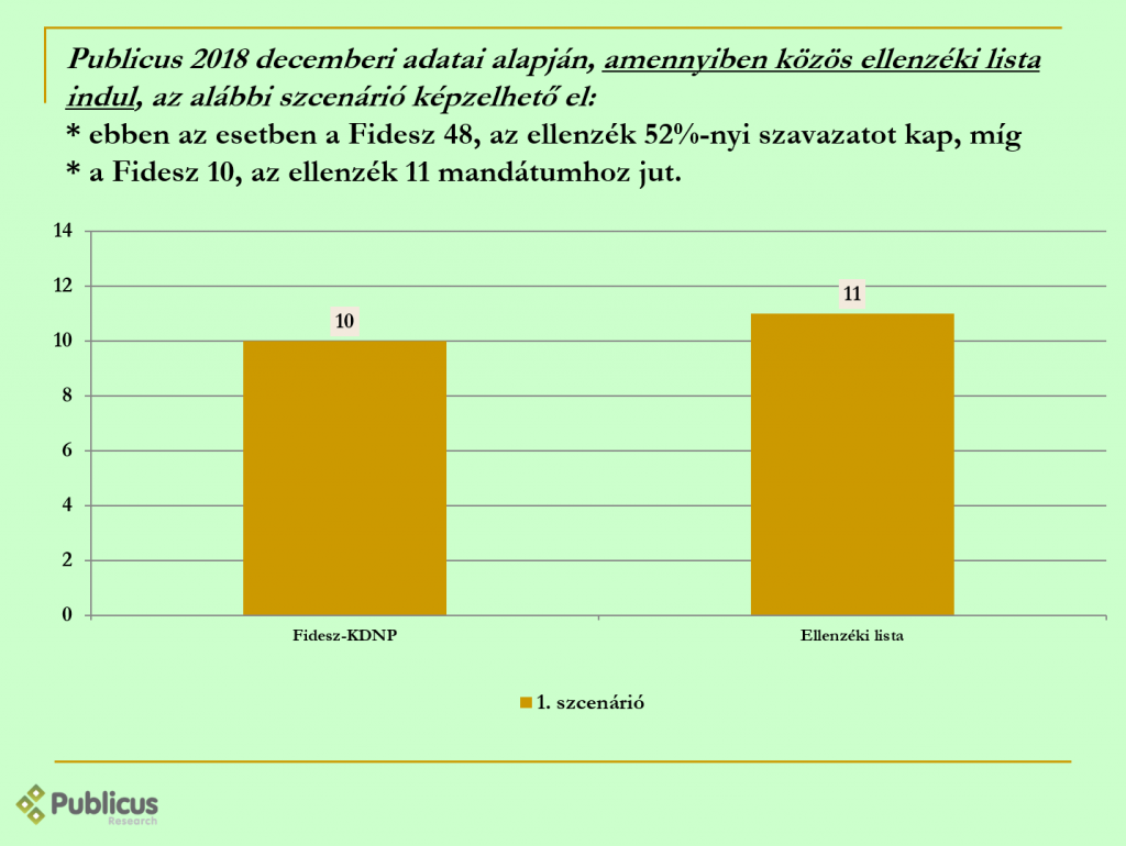 Amennyiben a Fidesz-ellenzék arány a 2018 decemberében mérthez hasonlóan alakul, akkor egy vagy két mandátum sorsát tudja befolyásolni az esetleges közös ellenzéki lista, illetve azt, hogy melyik „oldal” szerez több mandátumot (12-9 // 10-11).