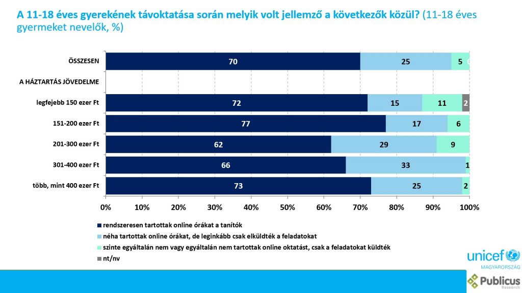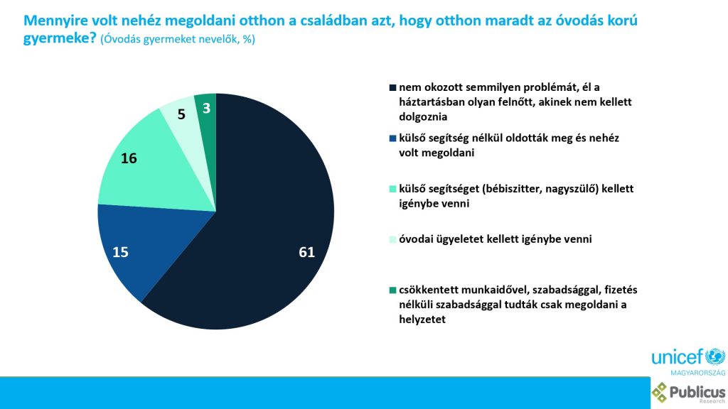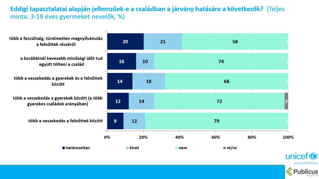 Minden harmadik magyar családban nőtt a feszültség a járvány hatására, a felnőttek 40%-a türelmetlenségről és a minőségi idő hiányáról vallott az UNICEF Magyarország reprezentatív felmérésében. Nagyjából minden tizedik család szembesült olyan problémával, ami megnehezítette az online tanulást, ez jellemzően az egyszülős háztartásokban volt gyakoribb.