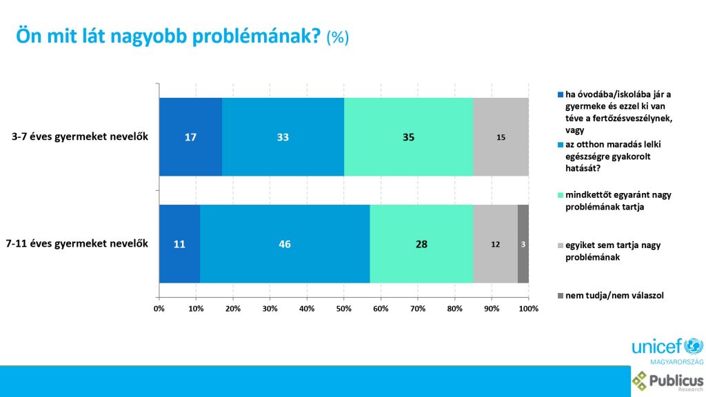 A felmérésben az óvodás gyermeket nevelő szülők 33%-a, a 7-11 évest nevelők 46%-a mondta azt, hogy az otthon maradás lelki egészségre gyakorolt hatását nagyobb problémának látta, mint a fertőzésveszélyt. A félelem nem volt alaptalan – ahogy arra a Publicus felmérése szintén felhívja a figyelmet: a magyar szülők fele szerint romlott a gyerekek mentális egészsége a járvány alatt.