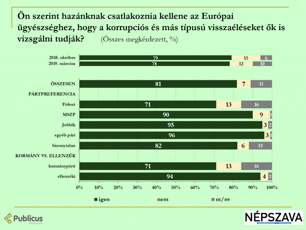 Tíz megkérdezettből nyolcan (81 százalék) úgy gondolják, hogy hazánknak csatlakoznia kellene az Európai Ügyészséghez. Ez a múlt hónapban mérthez képest három százalékpontos növekedés.