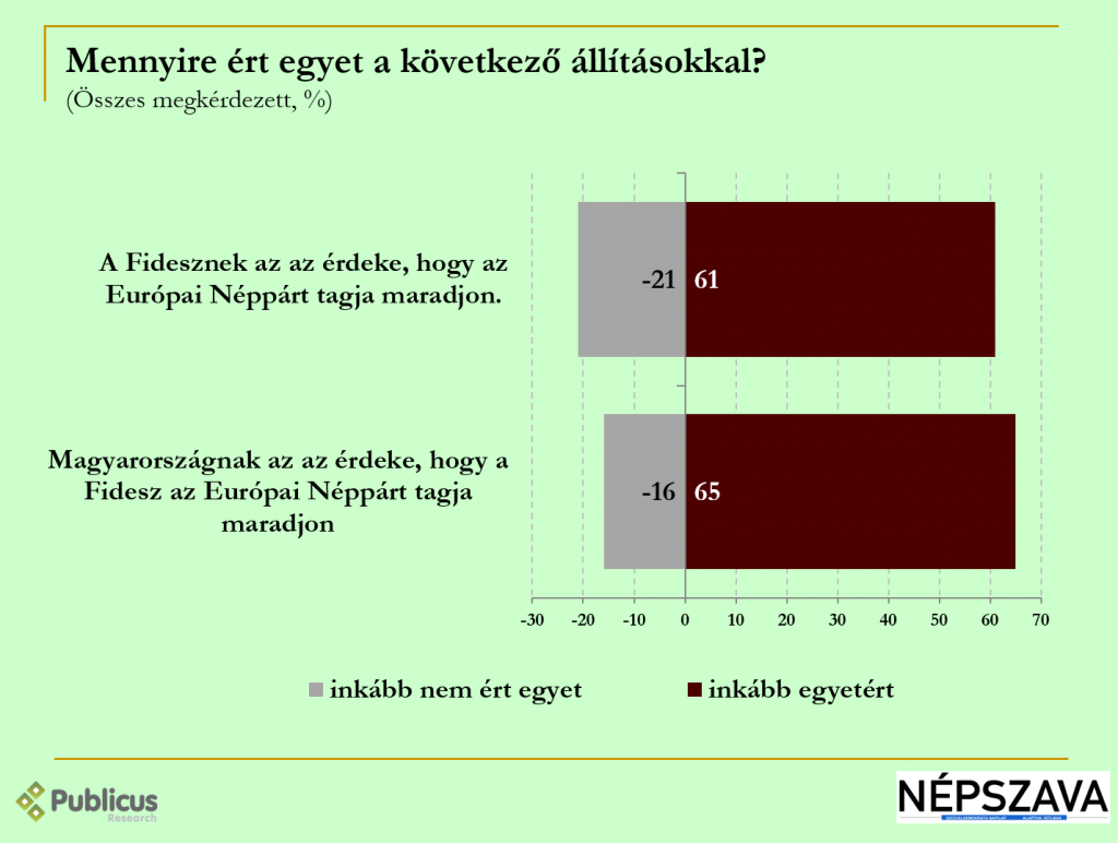 Tíz megkérdezettből hat fő (61 százalék) szerint a Fidesznek az az érdeke, hogy az Európai Néppárt (EPP) tagja maradjon, és kicsivel többen, majd’ kétharmadnyian (65 százalék) úgy gondolják, hogy ez hazánk érdeke is.