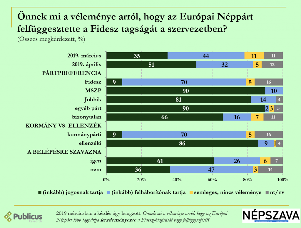 A megkérdezettek több mint fele (51 százalék) szerin jogos döntés, hogy az Európai Néppárt (EPP) felfüggesztette a Fidesz tagságát a szervezetben. Ez 16 százalékpontos növekedés a múlt hónapban mérthez képest. Egyedül a Fidesz szavazók az a vizsgált társadalmi csoport, amelyben az ellenkező álláspontnak van többsége: 70 százalék szerint felháborító a felfüggesztés, ám a múlt hónapban ez az arány még 85 százalékos volt.