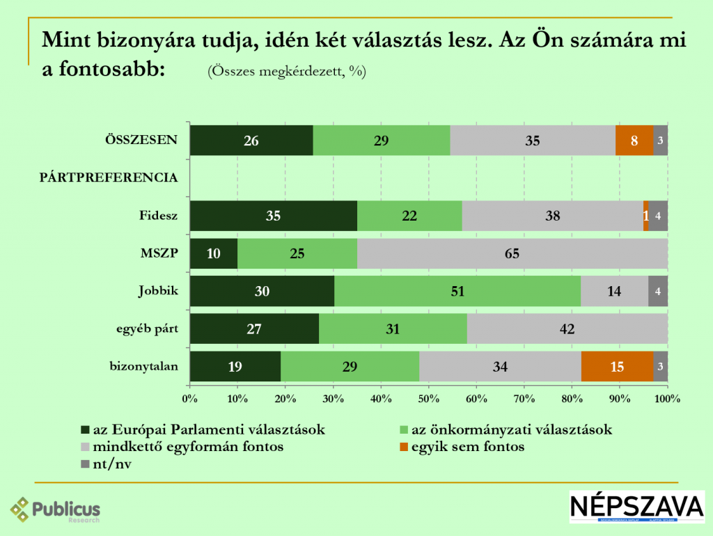 A megkérdezettek negyede (26 százalék) szerint az két idei választás közül a május végi EP választás a fontosabb, míg kicsivel többen (29 százalék) említették, hogy az önkormányzati. A válaszadók több mint harmada (35 százalék) szerint pedig mindkettő egyformán fontos.