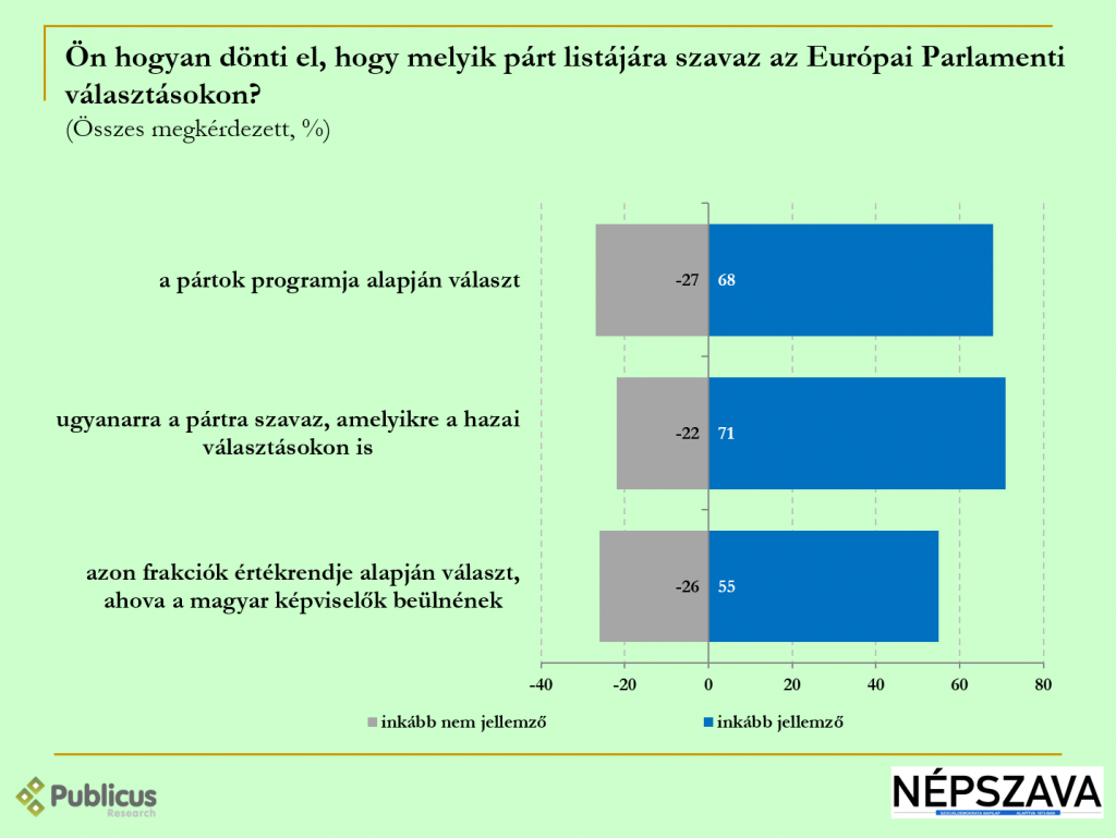 A megkérdezettek kétharmada (68 százalék) a pártok programja alapján választ, ám a képet árnyalja, hogy az EP-választási elképzeléseket az emberek fele (56 százalék) nagyjából, harmada (32 százalék) pedig sehogy nem ismeri.