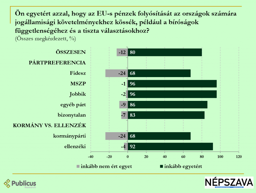 A megkérdezettek 80 százaléka támogatja, hogy az EU-s pénzek hazánkba érkezését az EU bizonyos jogállami normáknak való megfeleléshez kösse. Leginkább az MSZP és a Jobbik szavazók támogatják (96 százalék), ám a Fidesz szavazók körében is kétharmados (68 százalék) az elképzelés támogatottsága.