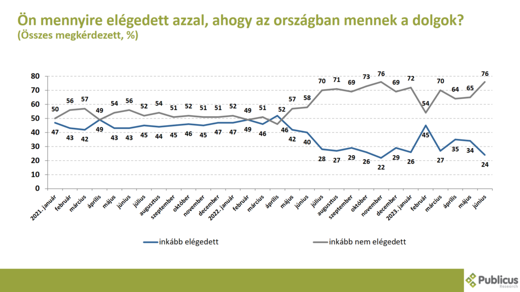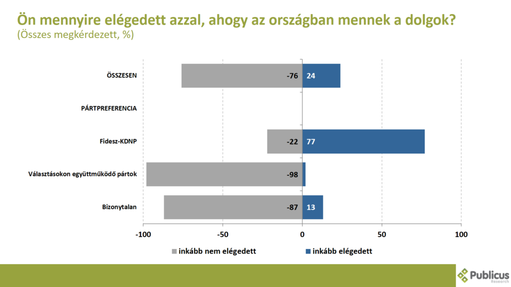 A válaszadók háromnegyede (76 százalék) inkább nem elégedett azzal, ahogy az országban mennek a dolgok. Így nyilatkozott a választásokon együttműködő ellenzéki pártok szavazói közül szinte az összes (98 százalék), tízből kilenc (87 százalék) bizonytalan szavazó, illetve a Fidesz szavazók közel negyede (22 százalék). A korábbi hónapokhoz képest az elégedettség leginkább az ellenzéki pártok szavazóinál és a bizonytalan szavazóknál csökkent, kisebb mértékben pedig a kormánypárti szavazóknál.