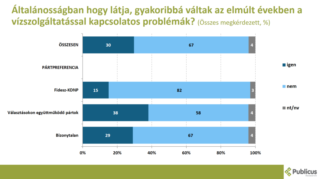 Tízből három (30 százalék) válaszadó általánosságban úgy látja, hogy gyakoribbá váltak az elmúlt években a vízszolgáltatással kapcsolatos problémák. Így nyilatkozott a választásokon együttműködő ellenzéki pártok szavazói közül tízből négy (38 százalék), tízből három (29 százalék) bizonytalan szavazó, illetve a Fidesz szavazók 15 százaléka.