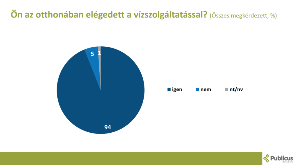 Ezzel együtt a megkérdezettek 94 százaléka mondta azt, hogy az otthonában elégedett a vízszolgáltatással. (5 százalék elégedettlen, 1 százalék pedig nem tudott vagy akart válaszolni a kérdésre).