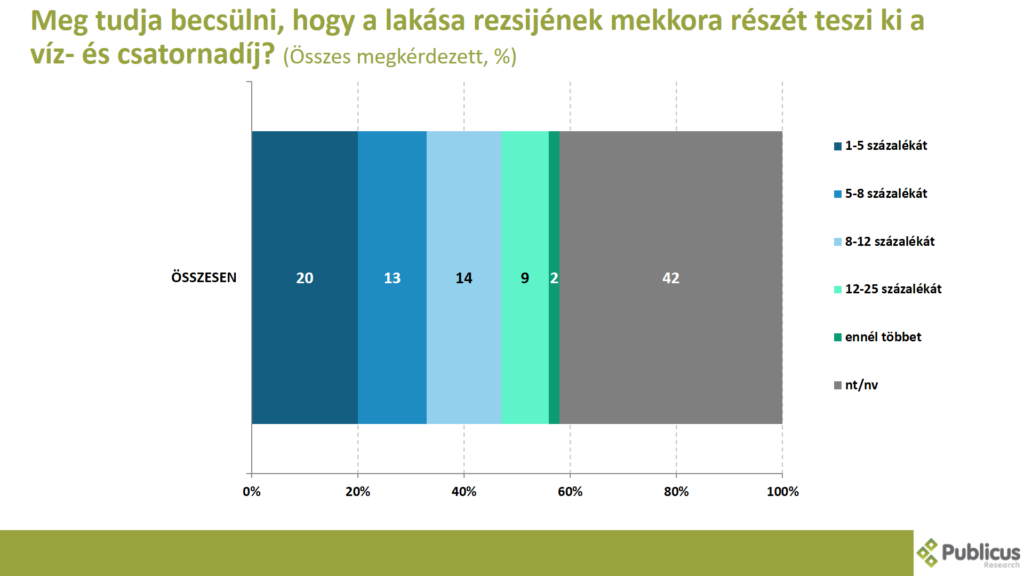 A megkérdezettek ötöde (20 százalék) úgy becsülte, hogy a lakása rezsijének 1-5 százalékát, közel nyolcada (13 százalék) 5-8 százalékát, hetede (14 százalék) 8-12 százalékát, a válaszadók közel tizede (9 százalék) szerint pedig 12-25 százalékát teszi ki a víz- és csatornadíj. (2 százalék még ennél is többet mondott, 42 százalék pedig nem tudott vagy akart válaszolni a kérdésre.)