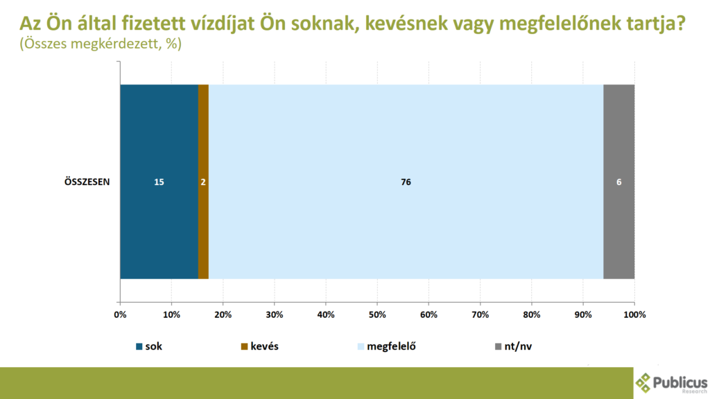 A válaszadók háromnegyede (76 százalék) megfelelőnek, 15 százaléka soknak, 2 százaléka pedig kevésnek tartja az általa fizetett vízdíjat. (6 százalék nem tudott, vagy nem akart válaszolni a kérdésre.)