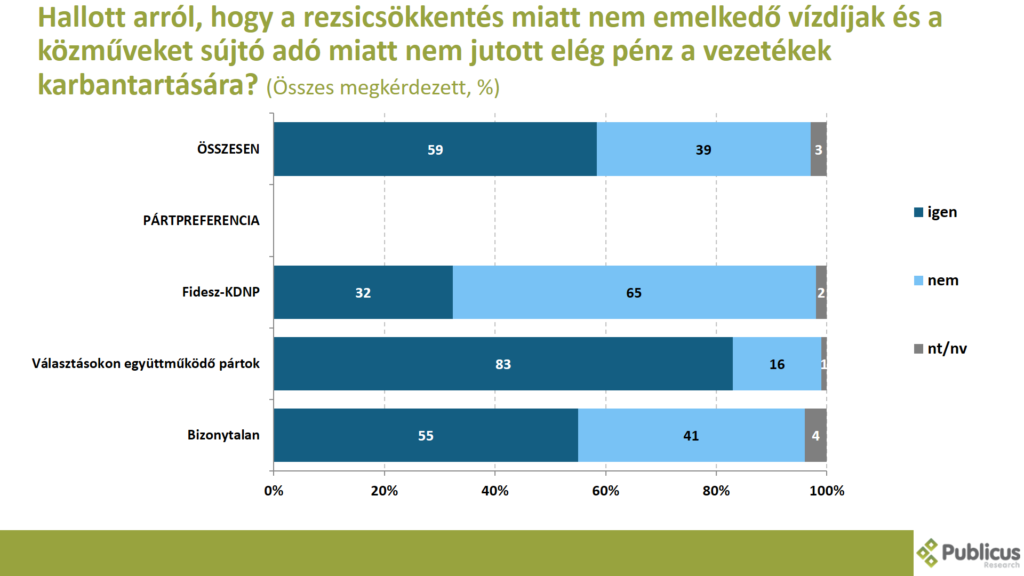 Tízből hat (59 százalék) megkérdezett hallott arról, hogy a rezsicsökkentés miatt nem emelkedő vízdíjak és a közműveket sújtó adó miatt nem jutott elég pénz a vezetékek karbantartására. Így nyilatkozott a választásokon együttműködő ellenzéki pártok szavazói tízből több mint nyolc (83 százalék), a bizonytalan szavazók közül tízből közel hat (55 százalék), illetve a Fidesz szavazók harmada (32 százalék).