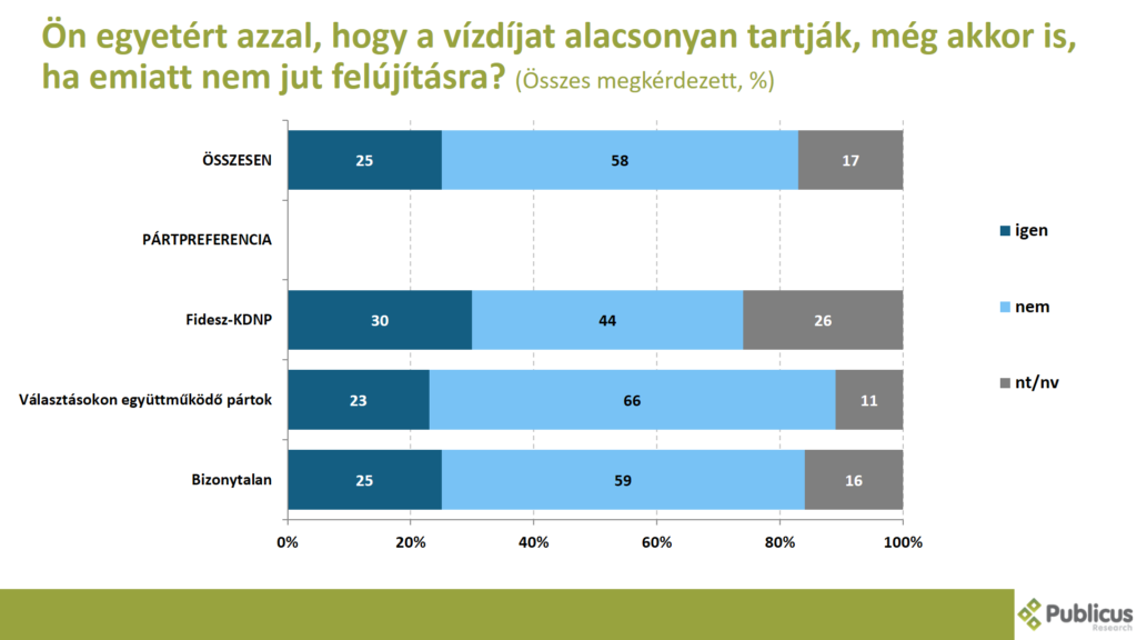 Tízből hat (58 százalék) válaszadó nem ért egyet azzal, hogy a vízdíjat alacsonyan tartják, még akkor is, ha emiatt nem jut felújításra.  Így nyilatkozott a választásokon együttműködő ellenzéki pártok szavazóinak a kétharmada (66 százalék), tízből hat (59 százalék) bizonytalan szavazó, illetve a Fidesz szavazók 44 százaléka.