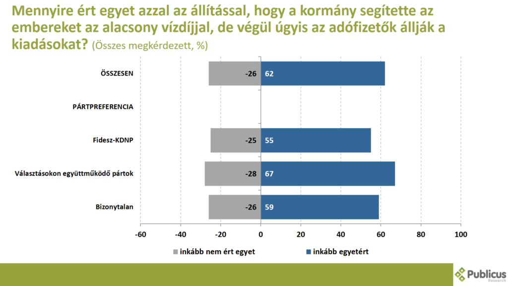 A megkérdezettek közel kétharmada (62 százalék) inkább egyetért azzal az állítással, hogy a kormány segítette az embereket az alacsony vízdíjjal, de végül úgyis az adófizetők állják a kiadásokat. Így nyilatkozott a választásokon együttműködő ellenzéki pártok szavazóinak a kétharmada (67 százalék), tízből hat (59 százalék) bizonytalan szavazó, illetve a Fidesz szavazók többsége (55 százalék).