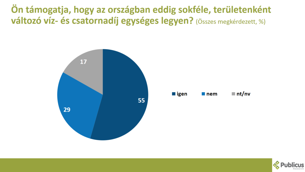 A többség (55 százalék) támogatja, hogy az országban eddig sokféle, területenként változó víz- és csatornadíj egységes legyen. (Tízből három – 29 százalék – válaszadó nem támogatja, közel minden ötödik – 17 százalék – megkérdezett pedig nem tudott, vagy nem akart válaszolni a kérdésre.)