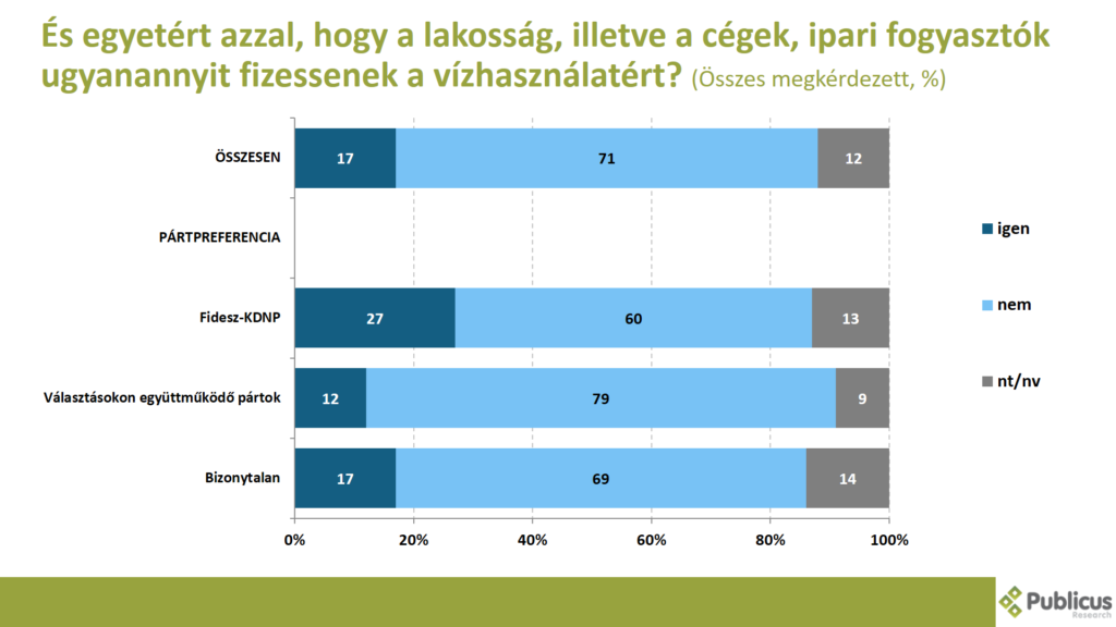 Tízből hét (71 százalék) megkérdezett nem ért egyet azzal, hogy a lakosság, illetve a cégek, ipari fogyasztók ugyanannyit fizessenek a vízhasználatért. Így nyilatkozott a választásokon együttműködő ellenzéki pártok szavazói közül tízből nyolc (79 százalék), tízből hét (69 százalék) bizonytalan szavazó, illetve tízből hat (60 százalék) Fidesz szavazó.