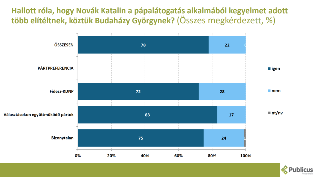 Tízből nyolc (78 százalék) válaszadó hallott arról, hogy Novák Katalin a pápalátogatás alkalmából kegyelmet adott több elítéltnek, köztük Budaházy Györgynek. Így nyilatkozott a választásokon együttműködő ellenzéki pártok szavazói közül tízből nyolc (83 százalék) a bizonytalan szavazók háromnegyede (75 százalék), illetve tízből hét (72 százalék) Fidesz szavazó.