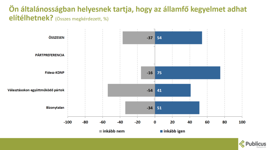 Az enyhe többség (54 százalék) általánosságban inkább helyesnek tartja, hogy az államfő kegyelmet adhat elítélteknek. Ezt mondta a Fidesz szavazók háromnegyede (75 százalék), minden második (51 százalék) bizonytalan szavazó, illetve a választásokon együttműködő ellenzéki pártok szavazói közül tízből négy (41 százalék).