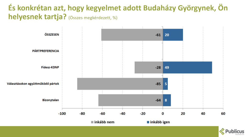 Minden ötödik (20 százalék) megkérdezett tartja inkább helyesnek, hogy az államfő kegyelmet adott Budaházynak. Így nyilatkozott minden második (49 százalék) Fidesz szavazó, a bizonytalan szavazók 8 százaléka, illetve a választásokon együttműködő ellenzéki pártok szavazóinak az 5 százaléka.