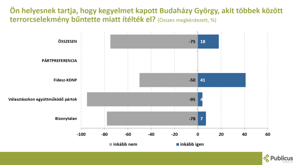A megkérdezettek háromnegyede (75 százalék) inkább nem tartja helyesnek, hogy kegyelmet kapott Budaházy György, akit többek között terrorcselekmény bűntette miatt ítélték el. Ezt mondta a választásokon együttműködő ellenzéki pártok szavazói közül szinte az összes (95 százalék), tízből közel nyolc (78 százalék) bizonytalan szavazó, illetve minden második (50 százalék) Fidesz szavazó.