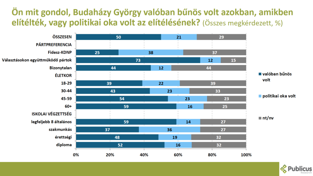 Minden második válaszadó úgy gondolja, Budaházy valóban bűnös volt azokban, amikben elítélték. Ezt mondta a választásokon együttműködő ellenzéki pártok szavazóinak közel háromnegyede, a bizonytalan szavazók közel fele, illetve a Fidesz szavazók negyede.