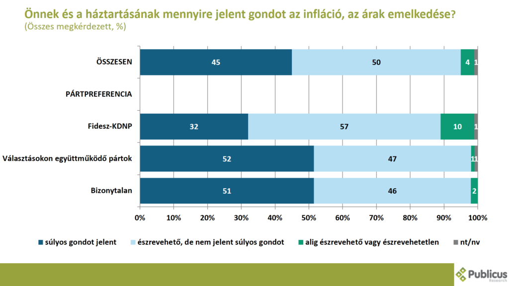 Minden második (50 százalék) válaszadó mondta azt, hogy észrevehető, de nem jelent neki súlyos gondot az infláció. Így nyilatkozott tízből közel hat (57 százalék) Fidesz szavazó, illetve a választásokon együttműködő ellenzéki pártok szavazóinak illetve a bizonytalan szavazóknak a közel fele. (47 és 46 százalék).