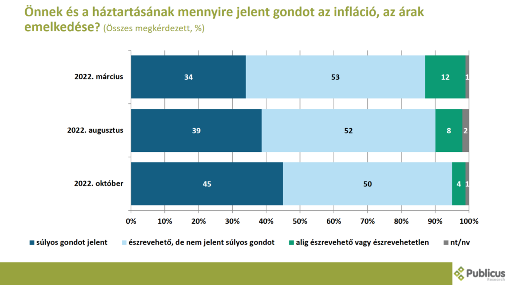 Hónapról hónapra egyre többen vannak azok, akiknek súlyos gondot jelent az infláció: míg 2022 márciusában a megkérdezettek 34 százaléka, 2022 augusztusában 39 százaléka, addig most októberben már a válaszadók 45 százaléka nyilatkozott így.