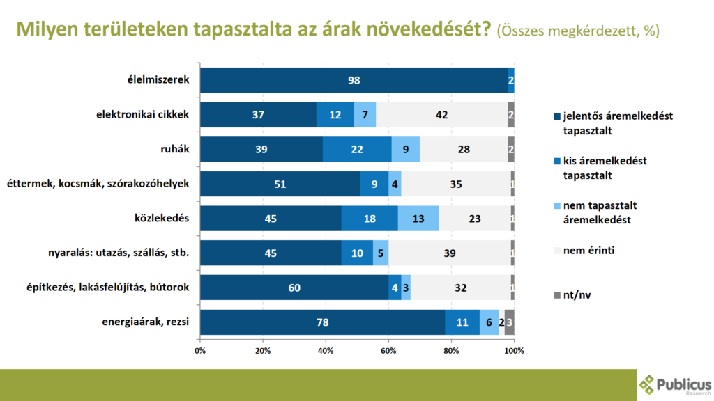 Szinte az összes válaszadó (98 százalék) jelentős áremelkedést tapasztalt az élelmiszereknél. Tízből nyolcan (78 százalék) az energiaáraknál,rezsinél, tízből hatan (60 százalék) pedig az építkezés, lakásfelújítás, és a bútorok árai kapcsán érzékeltek jelentős drágulást.